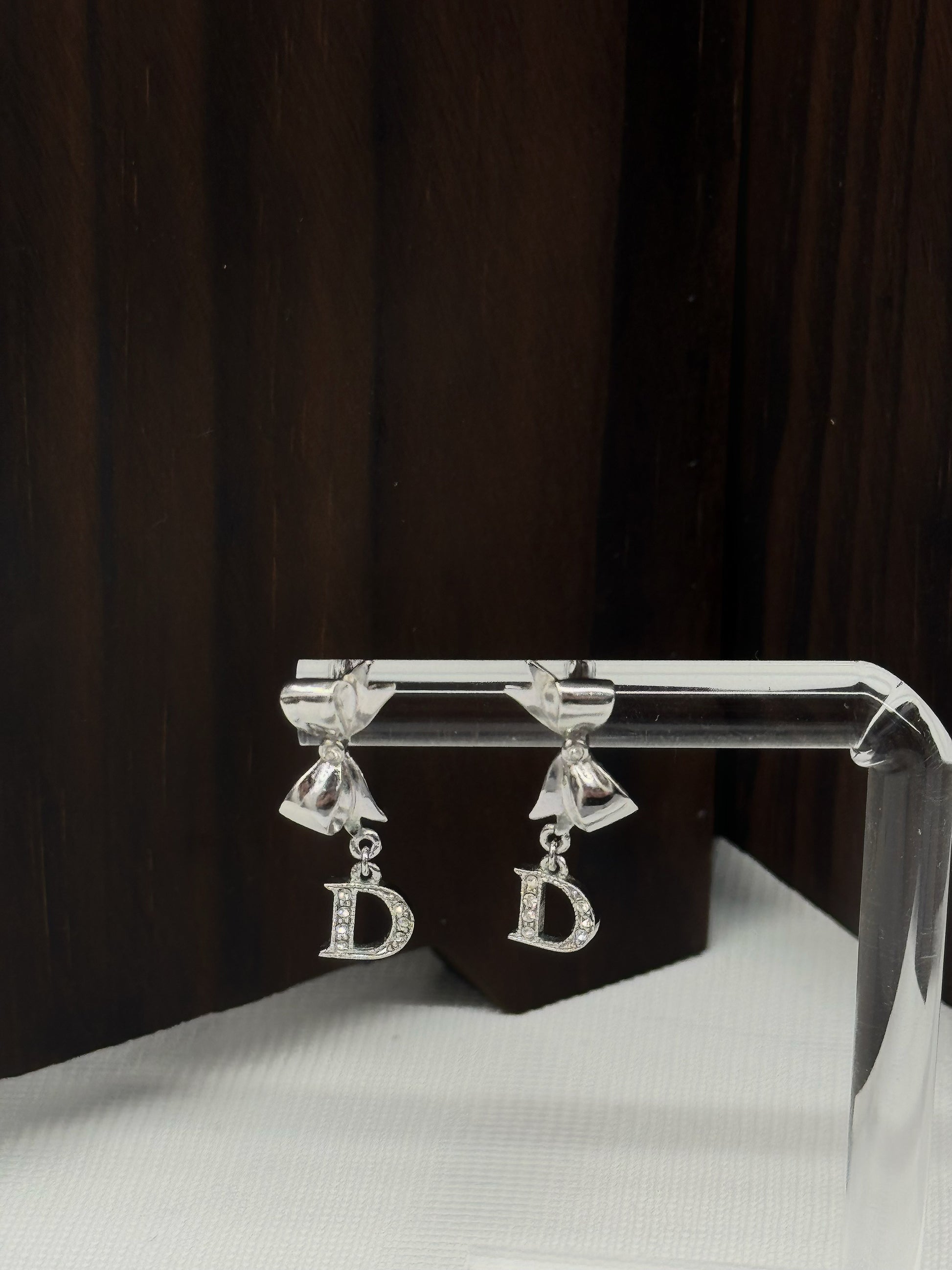 Dior silver rhinestone bow earrings with “D” charm